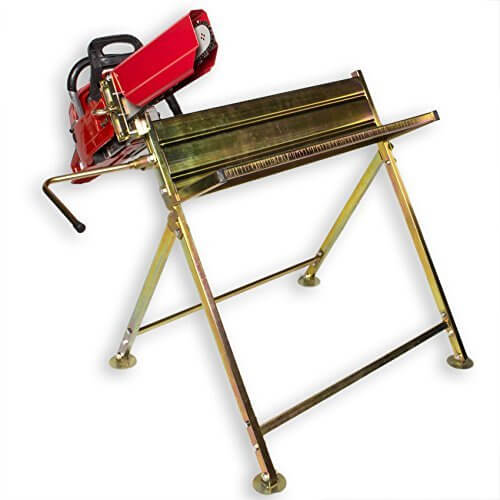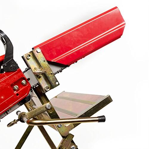 Produktdetailsinkl. Kettensägenhalter, für Rechts- und Linkshänder geeignet, Schutzklappe, stufenlos einstellbarer Ablänganschlag, zusammenklappbar, verzinkter & chromatisierter Stahl, Maße aufgerichtet 77 x 67 x 90 cm, Traglast 120 kg, Stammdurchmesser 30 cm